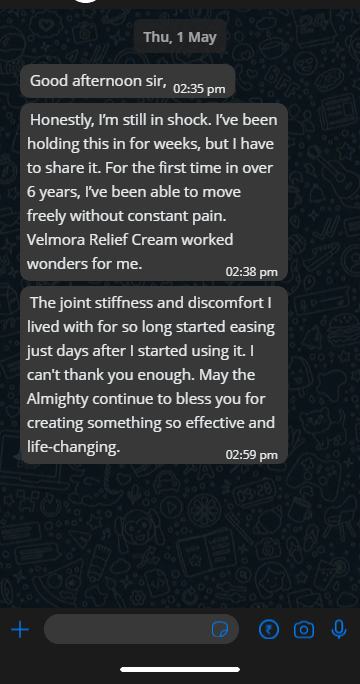 “My mum couldn’t sleep well because of body pain. Velmora changed that in just two days. Thank you!”